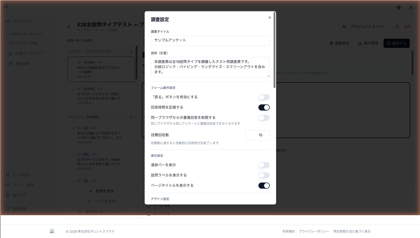 調査設定では、アンケートのタイトルや説明などの 基本情報、目標回収数や重複回答制限などの 回答制御、戻るボタンや設問ラベルなどの 表示制御 を一画面で調整できます。
