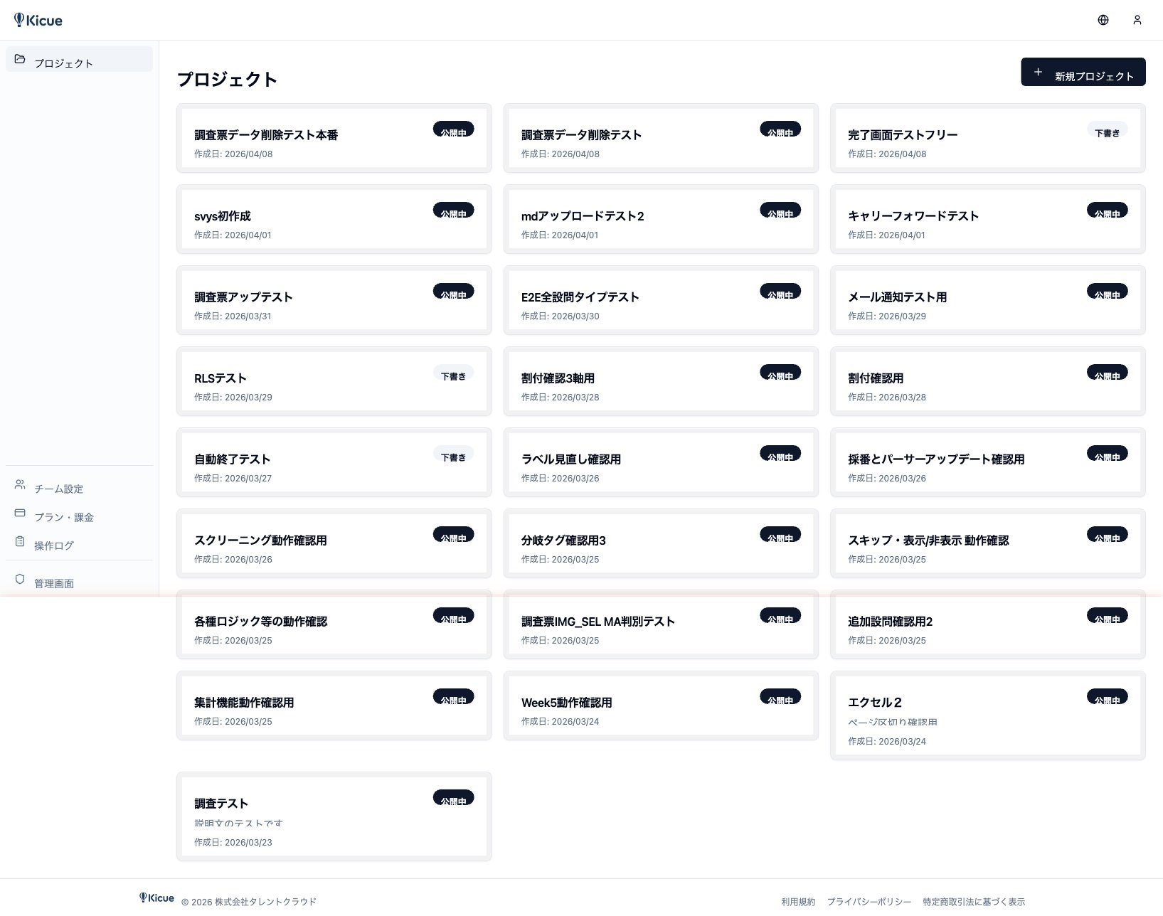 ダッシュボードで「新規プロジェクト」ボタンをクリックし、プロジェクト名(例: 「新商品コンセプトテスト 2026Q2」)を入力して作成します。