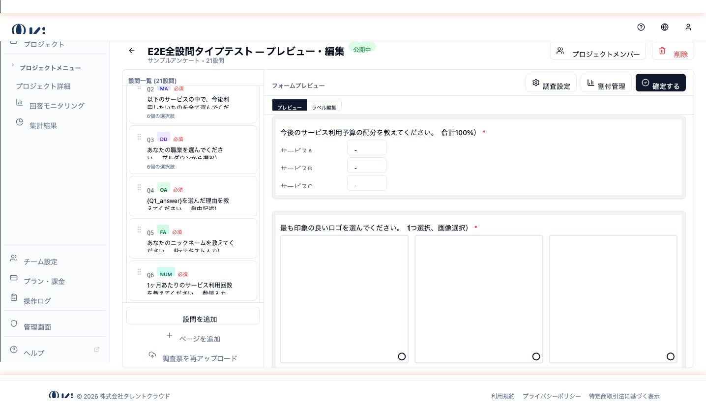 ALLOC(Allocation / Constant Sum) は、複数の項目に対して 合計が一定値になるように配分 してもらう設問タイプです。重要度や予算配分などを 相対的に測る のに適しています。