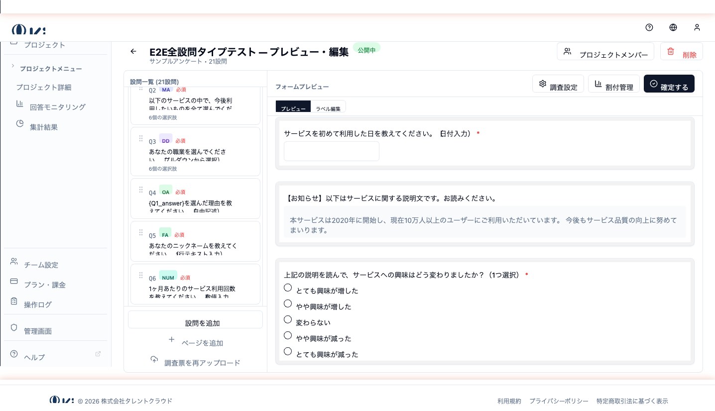DATE は、カレンダー UI から日付を選んでもらう設問タイプです。自由記述で日付を入力させるより、フォーマット揺れが起きにくく集計も容易です。