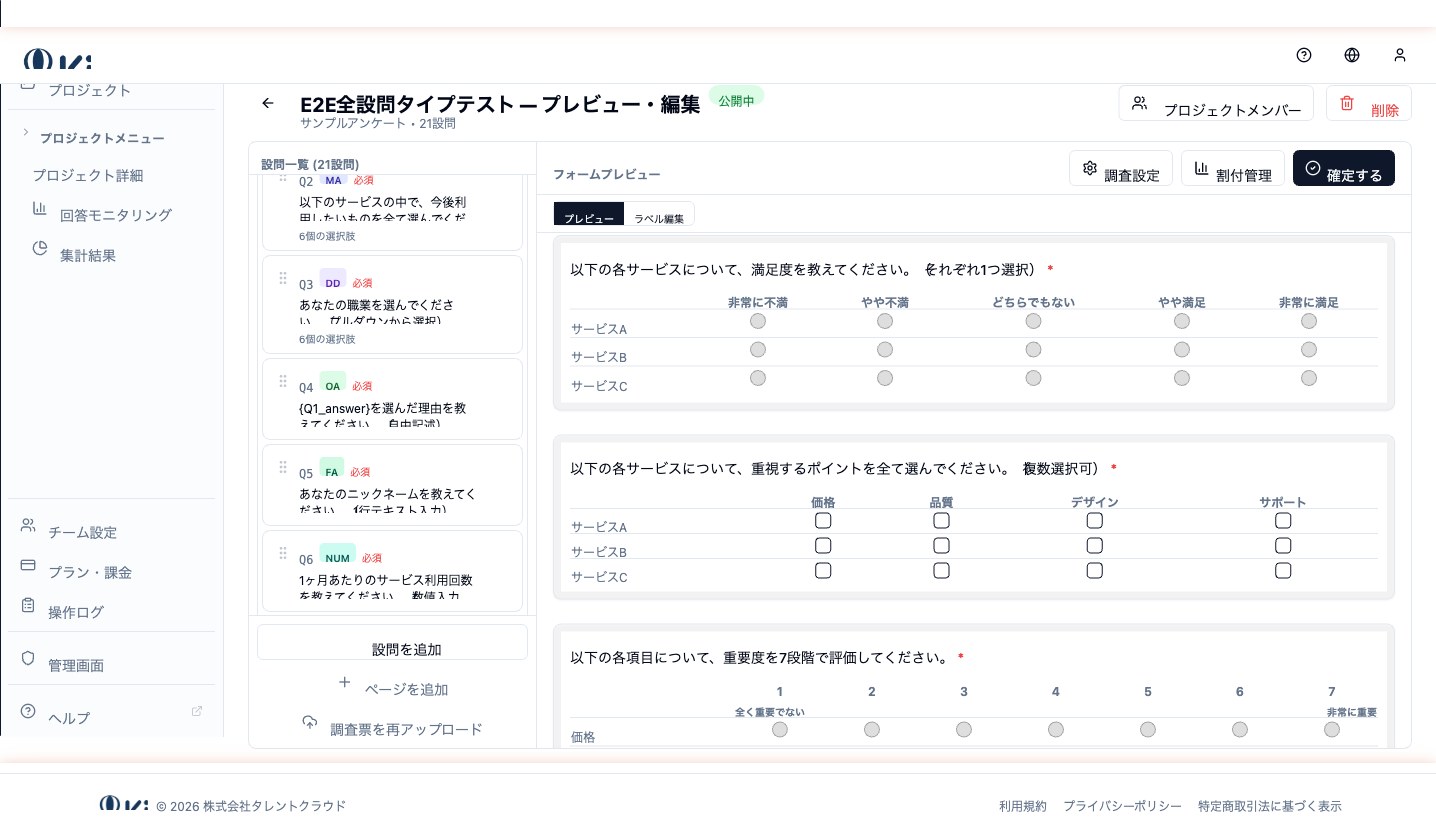 設計画面では行と列を個別に編集でき、ランダマイズや必須回答の設定も項目ごとに可能です。