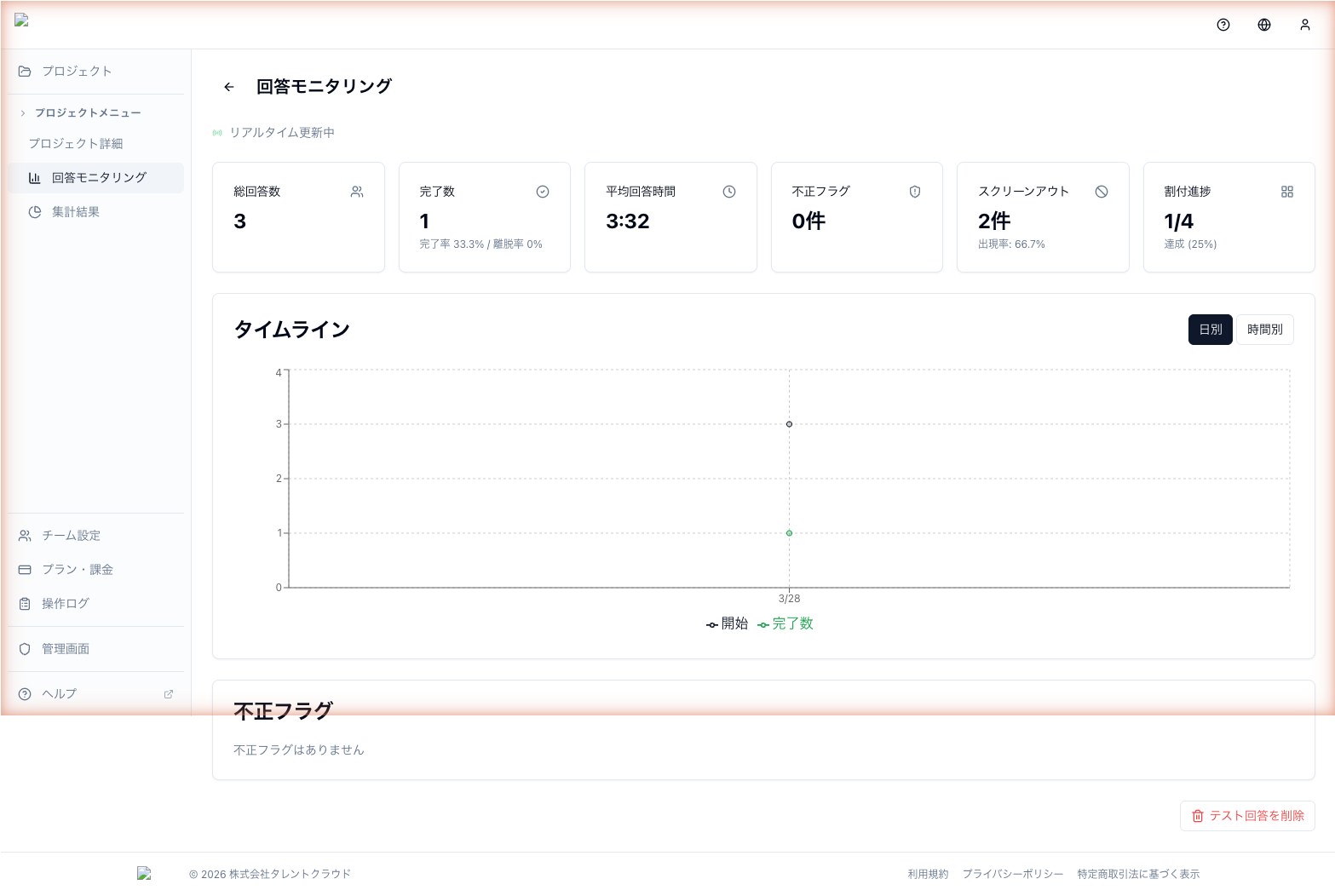 公開後の割付状況は、モニタリング画面の 割付カード からリアルタイムに確認できます。集まり具合をチェックしつつ、定員に達したセルはブラウザ側で自動的に対応されます。