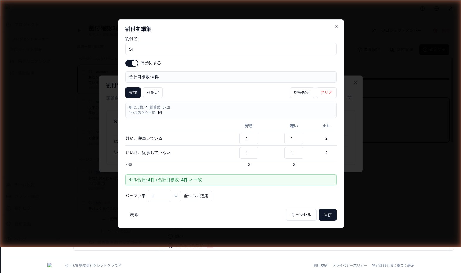 ここでは、割付管理ダイアログを使ってセルごとの目標数を設定する手順を説明します。基本概念については 割付の考え方 を先にご覧ください。